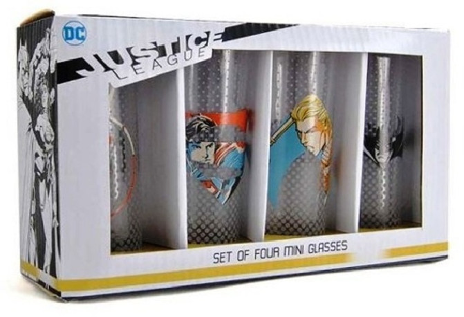 Oficiální sklenice s logem a grafikou DC Comics. set 4 kusů mini sklenic z čirého skla s logem a grafikou hrdinů DC Comics. Objem sklenice: 100 ml