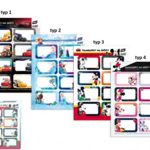 • Samolepky na sešity s obrázky z pohádek od Walt Disney, aršík obsahuje 8 různých motivů samolepek k polepení sešitů. Na samolepkách najdete obrázky z pohádek Cars (Auta), Frozen (Ledové království), Mickey Mouse, a Minnie Mouse. Každá samolepka obsahuje 4 řádky, kde můžete například napsat jméno a příjmení, předmět, název školy, třídu. Nálepky jsou k dostání ve čtyřech variantách. Rozměr Archu:…